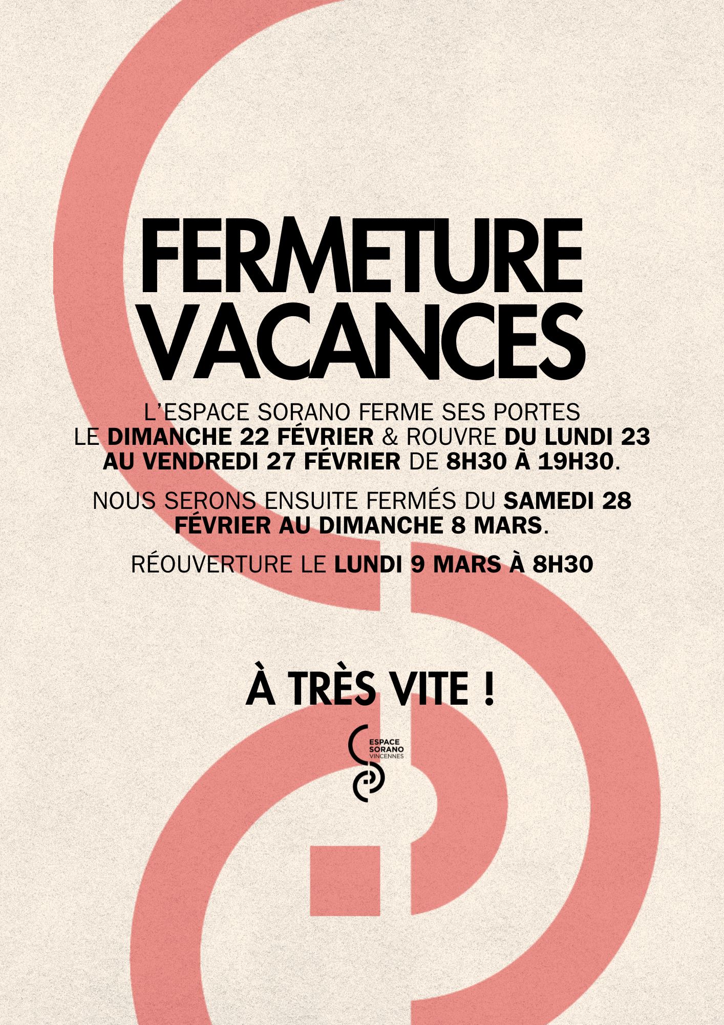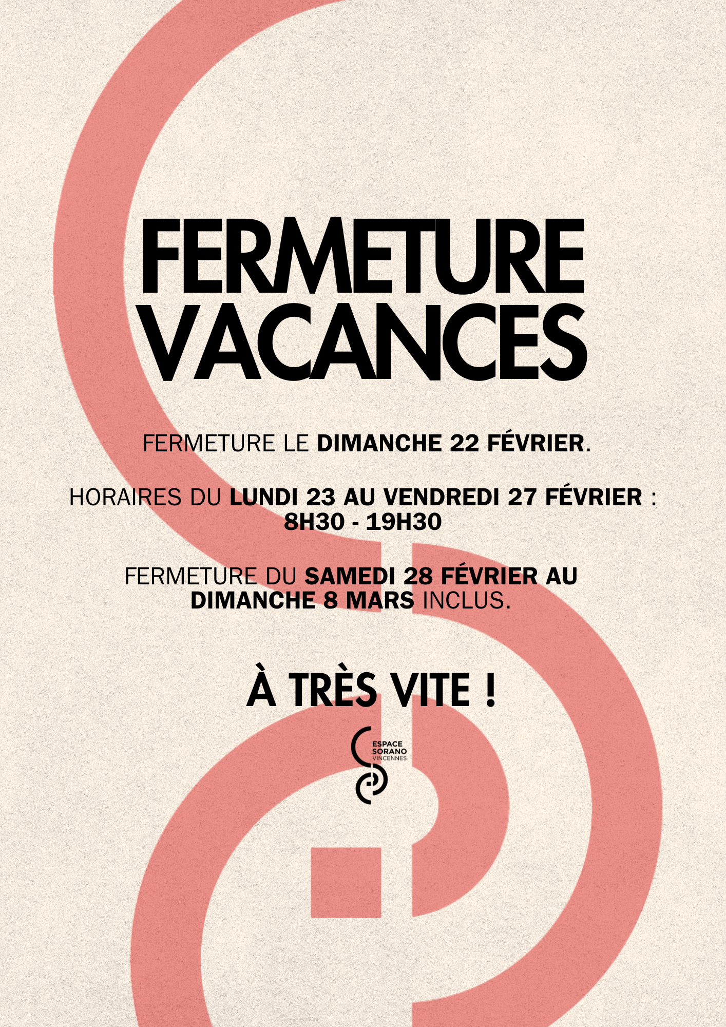 Fermeture du samedi 28 février au dimanche 8 mars inclus.